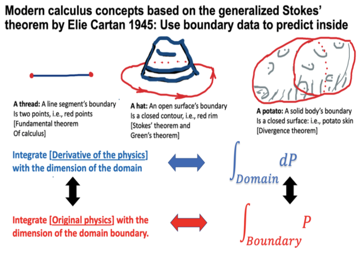 The boundary of a solid, such as a potato, is a closed surface, e.g., the potato skin. A relationship between an integration in the solid and another on the closed surface corresponds to Gauss’ law of electric field or magnetic field. In calculus, this corresponds to the divergence theorem.